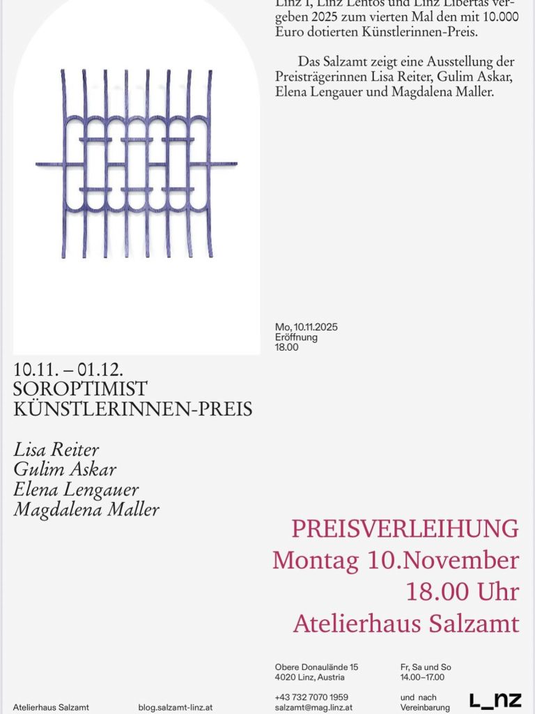 Die feierliche Preisverleihung findet am Montag, den 10. November 2025 um 18 Uhr im Atelierhaus Salzamt in Linz statt. Anschließend wird eine kuratierte Ausstellung der Preisträgerinnen vom 10. bis 30. November 2025 im Atelierhaus Salzamt zu sehen sein.