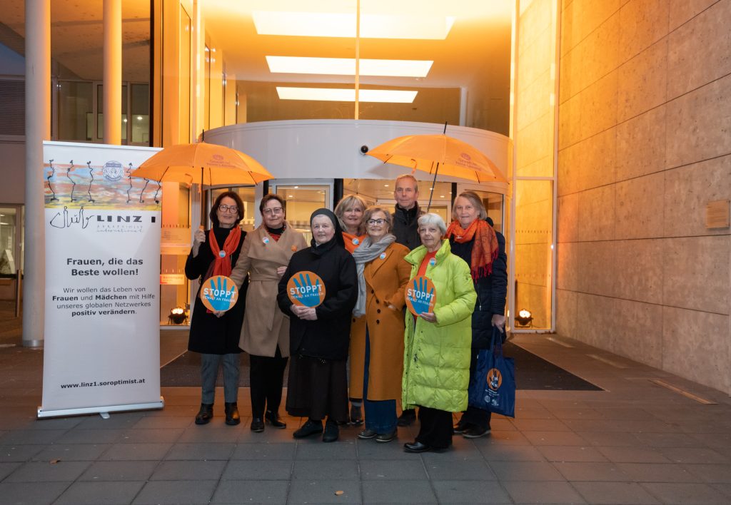 „Die Signalfarbe Orange macht nicht nur warnend auf häusliche Gewalt an Frauen und Mädchen aufmerksam, sondern steht auch für Mut, Enthusiasmus und Wärme. Diese Energie wollen wir Frauen und Mädchen in prekären Situationen mithilfe der Aktion näher bringen. Unsere Botschaft lautet „We stand up for Women!“ – Frauen und Männer sollen sich also gemeinsam für ein Ende der Gewalt an Frauen stark machen“, so die Soroptimist Club Linz I-Präsidentin Mag.a Wilma Steinbacher. Den Soroptimistinnen ist es ein Anliegen, Gewalt gegen Frauen sichtbar zu machen – in all seinen Ausprägungen thematisieren und ins Bewusstsein zu rücken. Soroptimist Club Linz I schließt sich der Kampagne „Orange the World“ an, um auf das Recht auf ein gewaltfreies Leben aufmerksam zu machen und die politisch Verantwortlichen aufzu-fordern, diesem wichtigen Themenfeld mehr Bedeutung zuzumessen.